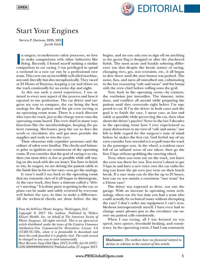 Davison SP, Nieb J. “Start Your Engines,” Plastic and Reconstructive Surgery Global Open. 3(8): e498, August 2015.
